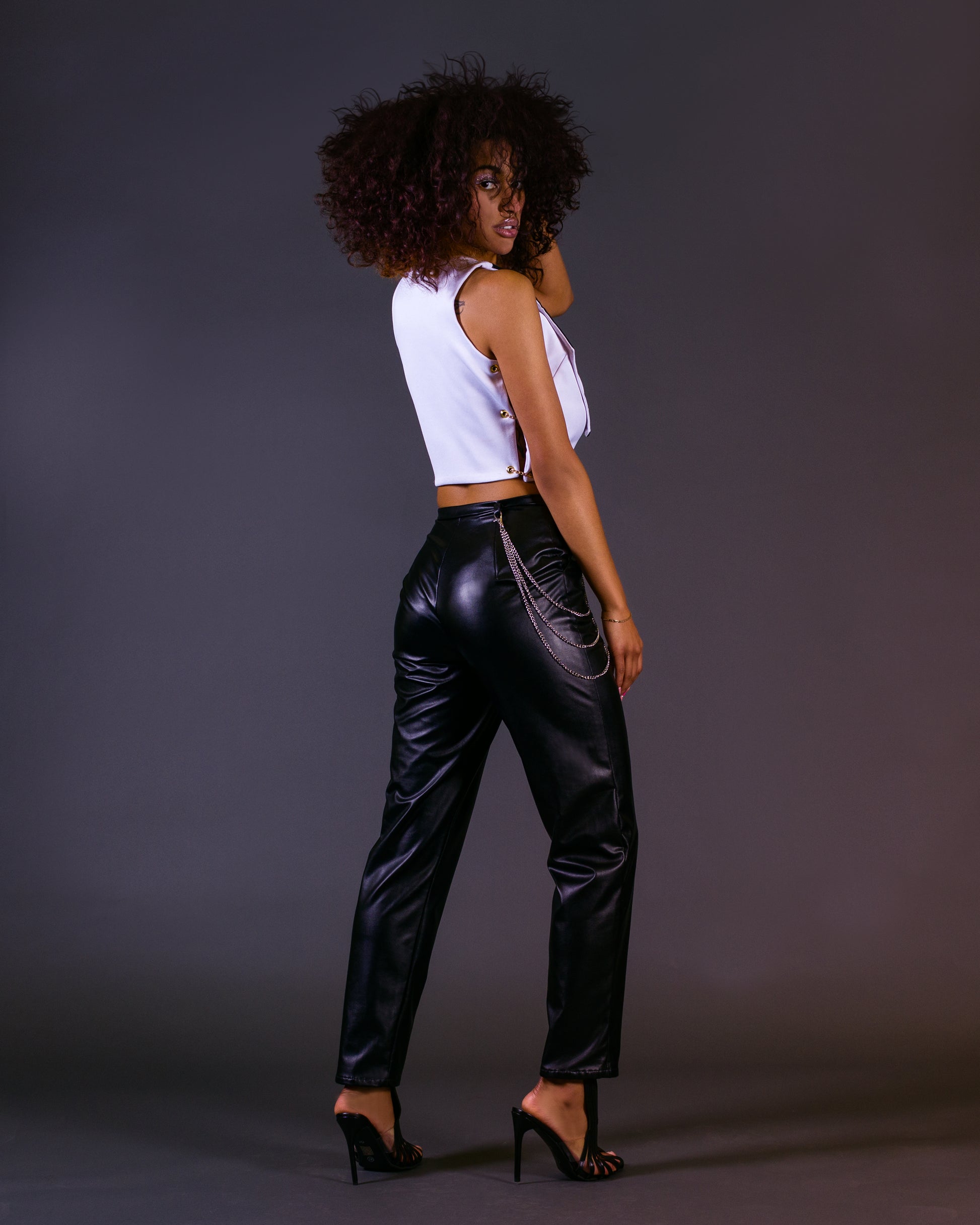 Unleash your edge with these bold biker faux leather pants. Crafted from sleek black faux leather with a rebellious attitude, they feature functional pockets to keep your essentials secure and stretch fabric for unrestricted movement. The biker-inspired design delivers that fearless, commanding look whether you're hitting the road or owning the night. Comfortable enough for all-day wear, daring enough to turn heads.