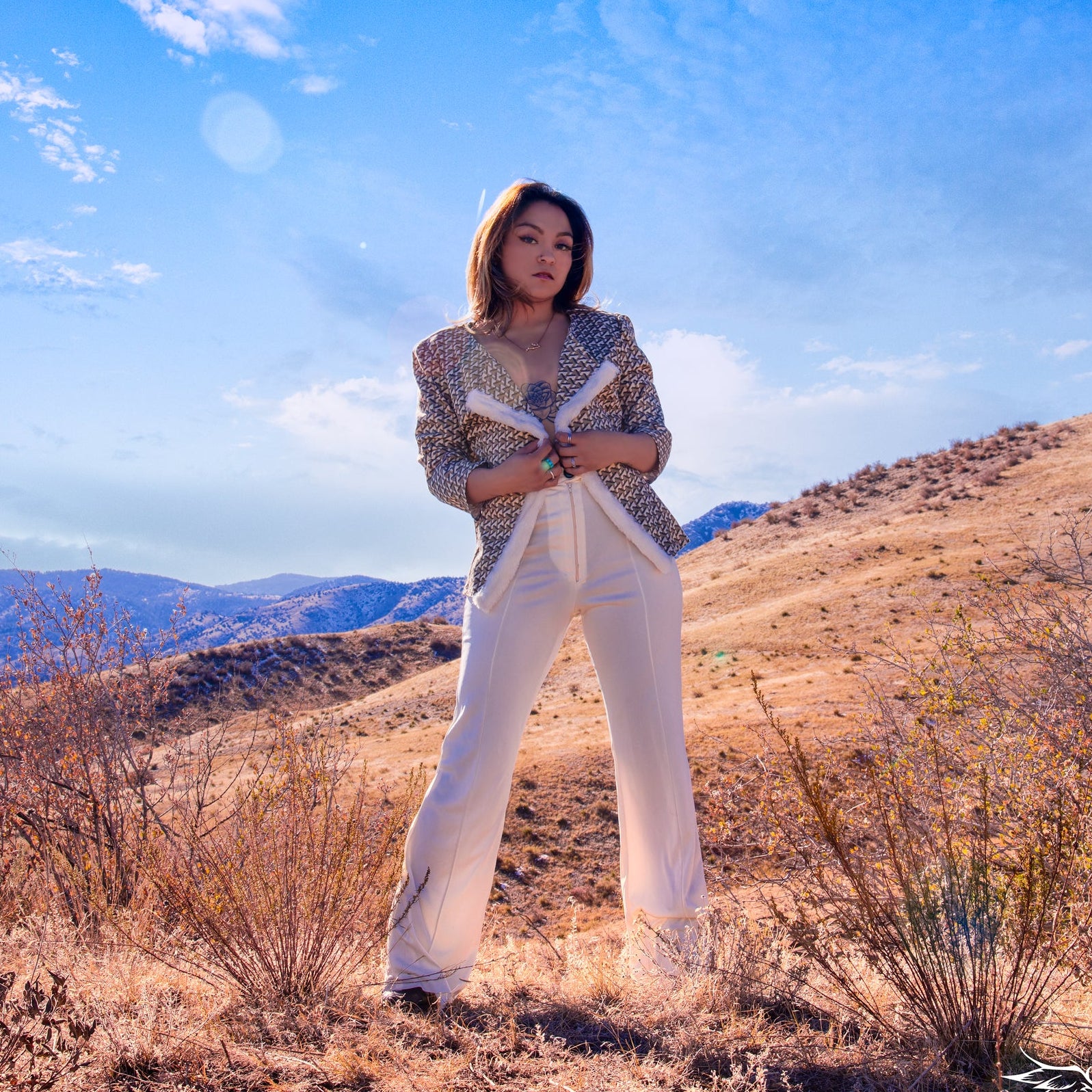 This geometric-patterned jacket from the "Ragnarök" Collection merges bold visual interest with refined tailoring. Intricate geometric motifs establish character, while luxurious faux trim along the edges elevates the overall aesthetic with textural sophistication. A versatile layering piece that transitions seamlessly across seasons, this jacket anchors any outfit with distinctive style and polished elegance, offering both visual impact and wearable refinement.