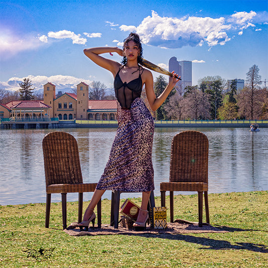 One-Piece Animal Print Corset Maxi Dress with Sheer Detailing.