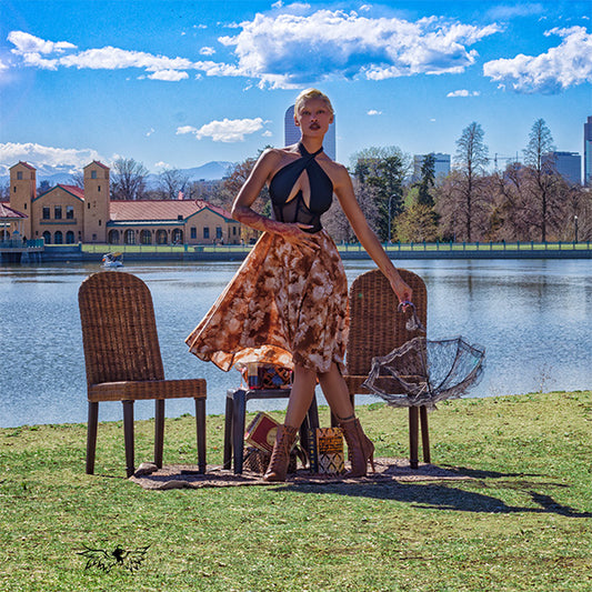 One-Piece Corseted A-Line Brown Leaf Patterned Skit